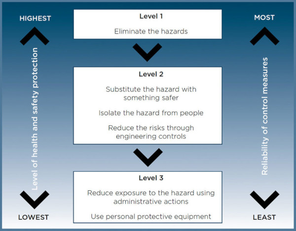 The hierarchy of control is a set of six questions that must be considered from the top down: